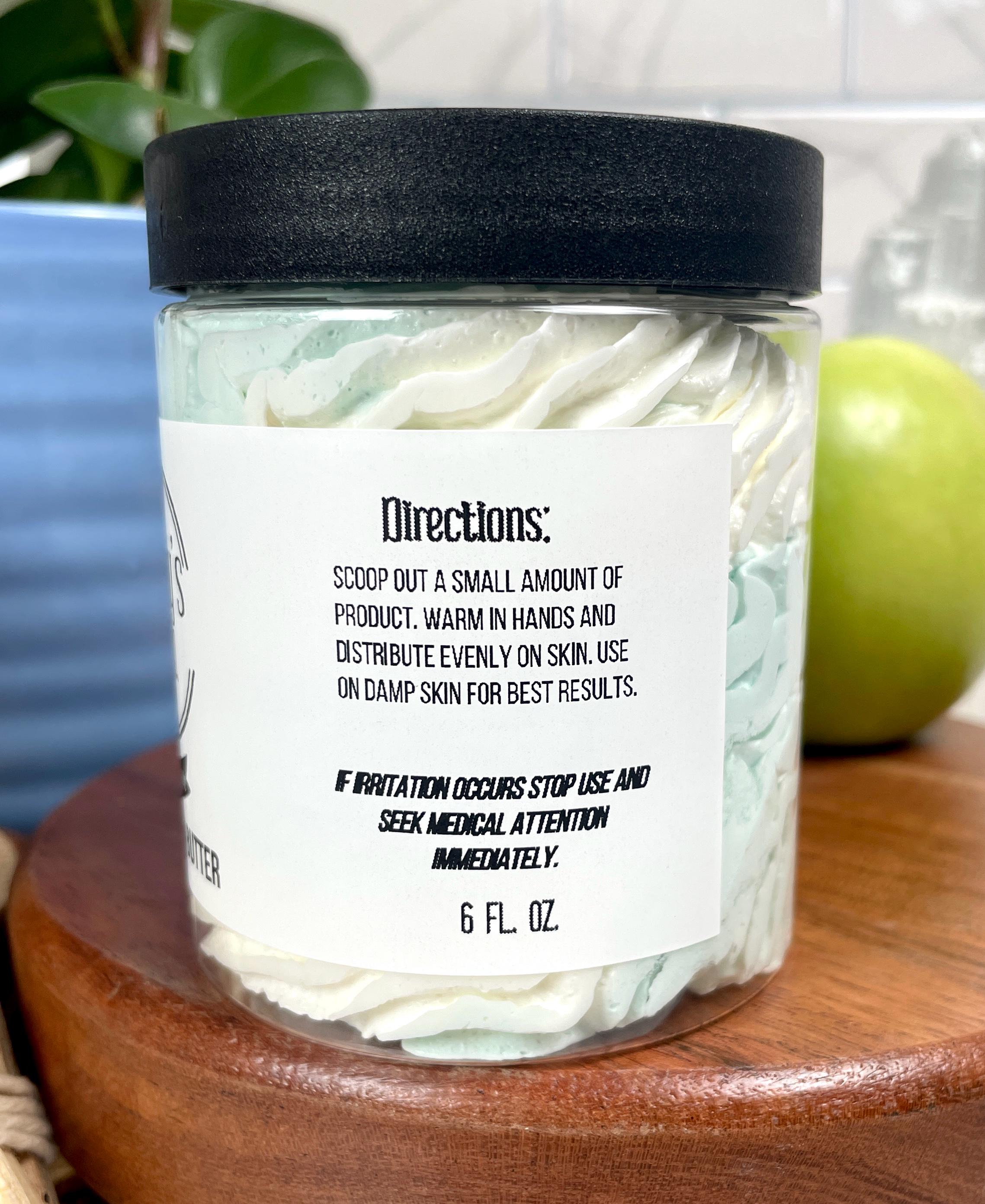 DIRECTIONS FOR USE: Scoop out a small amount of product, warm body butter between hands and spread evenly over skin. Be sure to rub in thoroughly so that the skin can absorb the oils/butters. Start with a dime to quarter size, a little goes a long way, and the body butter can get greasy if too much product is applied. Best applied to damp, towel-dried skin right out of the bath or shower.